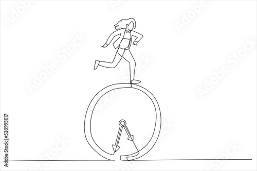 Cartoon of businesswoman running on clock. Deadline concept. Single continuous line art style