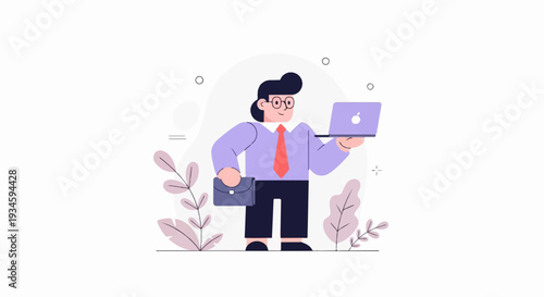 cartoon, person, business, attire, holding, laptop, briefcase, decorative, plant, man, work, professional, office, employee, manager, executive, career, job, digital, technology, communication, connection, modern, graphic, illustration, clean, simple, flat, design, style, corporate, meeting, presentation, online, study, cognition, learning, idea, concept, inspiration, success, achievement, goal, strategy, finance, investment, growth, innovation, planning