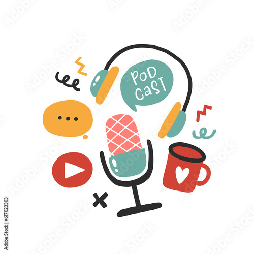 Cartoon podcast on air composition with microphone. Speech, Wireless or Broadcast Illustration. Trendy Sign and Symbol for Design and Websites, presentation or application. Cover art design