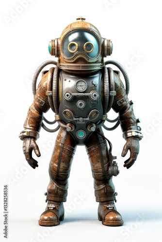 three-dimensional, single object, illustration, full-length, studio shot, futuristic, protection, space suit, technology, astronaut, character, realistic, gas-mask, isolated, security, standing, cartoon, cut-out, graphic, history, machine, vintage, armoring, person, diver, human, metal, ratio, robot, aqualung, white, body, full, toy, three-dimensional