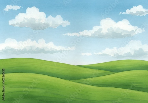 Cartoon rolling hills, blue sky, fluffy white clouds, nature landscape, serene scenery background.
