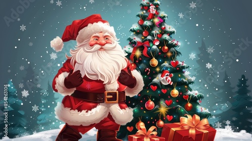 Cartoon Santa Claus with a blurred face standing near a decorated Christmas tree with gifts underneath