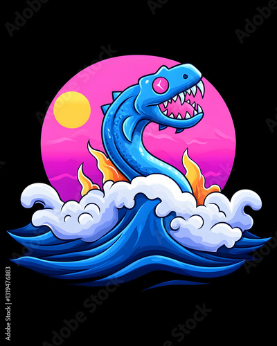monster, sea, creature, wave, ocean, fire, cartoon, graphic, design, illustration, digital, art, print, shirt, apparel, cute, cool, vibrant, colours, retro, 80s, 90s, style, fantasy, mythical, dragon, snake, beast, aquatic, t-shirt, colourful, oceanic, energy, creative, drawing