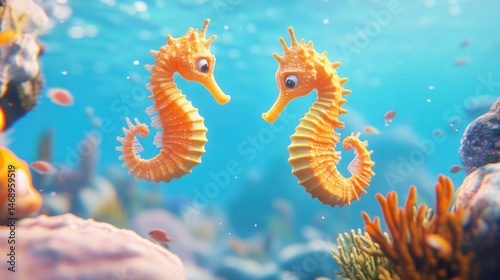 seahorse, ocean, coral, reef, cartoon, underwater, marin, animal, aquatic, fish, sea, water, nature, wildlife, cute, adorable, funny, happy, love, romance, couple, pair, friendship, family, playful, vibrant, colourful, bright, summer, tropical, animal, background, illustration, design, artwork, image, graphic, photo