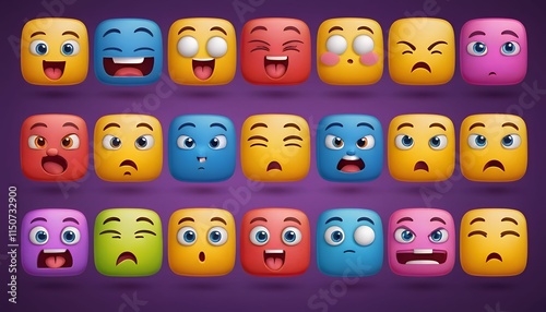 Cartoon set of cute square emoji with different emotions. Illustration of neon color funny faces smiling, angry, bored, scared, surprised, crazy, laughing. Game characters. Chat message symbols