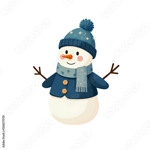 snowman, cartoon, winter, hat, foulard, blue, holiday, cute, festive, christmas, jacket, pom-pom, star, buttons, snow, white