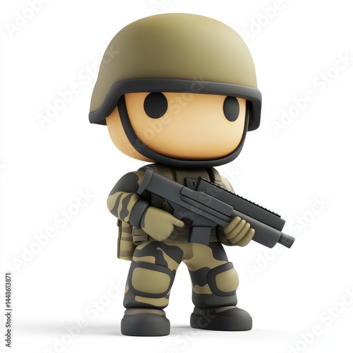 cute, three-dimensional, sticker, rendering, soldier, figure, cartoon, military, armed, weaponry, rifle, combat, uniform, gear, equipment, protection, tactical, camouflage, army, defense, war, warfare, illustration, graphic, character, design, model, representation, action, pose, standing, holding, weapon, realistic, stylised, digital, artwork, isolated, background, front, perspective, combatant
