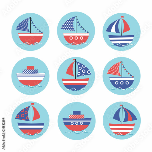 Cartoon stickers with colored boats in the sea. Children's drawing. Vector illustration