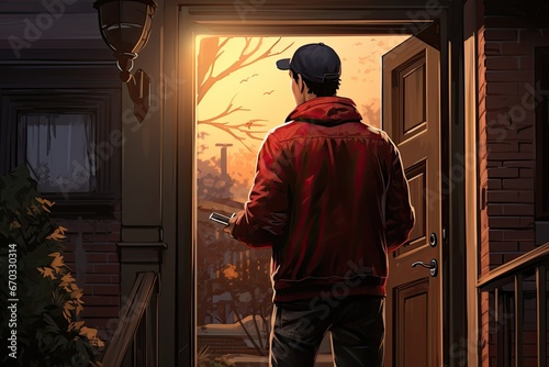 front door, residential, illustration, vector, cartoon, courier service, home delivery, doorstep, parcel, shipping, logistic, postal service, mail, online shopping, transportation, e-business, receiving, signature, delivery person, box, cardbox, shipment, client, delivery truck, doorbell