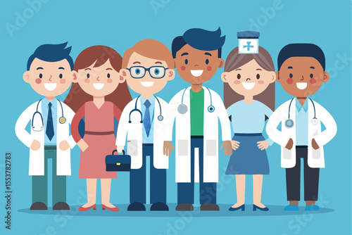 Cartoon style team of doctors united in healthcare, showcasing diversity and professionalism while promoting wellness and teamwork in a cheerful environment