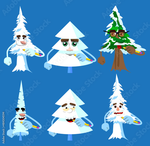 Cartoon winter pine trees with faces writing with pencil. Cute forest trees. Snow on pine cartoon character, funny holiday vector illustration.