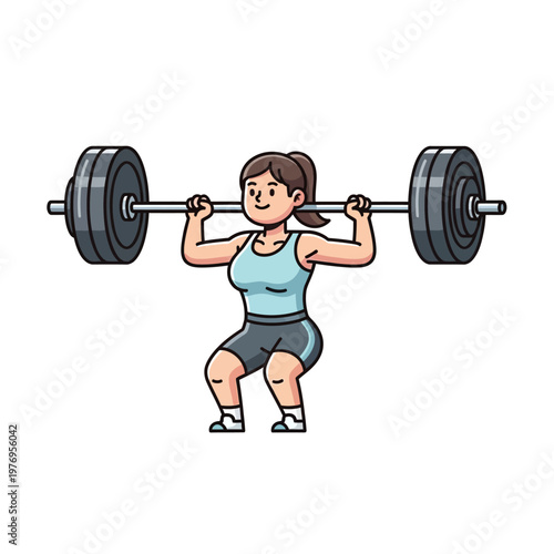 woman, lifting, barbell, squat, weightlift, fitness, strength, training, exercise, gym, healthy, lifestyle, cartoon, illustration, active, physical exercise, muscle, power, sport, athlete, bodybuilding, recreation, leisure, health, body, person, female, adult, young, 1, people, simple, flat, graphic, design, drawing, art, casual attire, equipment, weight, heavy, progress, achievement, motivation, challenge, dedication, endurance, wellness, habit