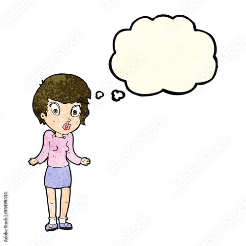 woman, female, girl, shrugging, shoulder, cartoon, thought bubble, thought, character, cheerful, clip art, clip, art, doodle, drawing, drawn, funny, hand, traditional, illustration, quirky, retro, silly, confused