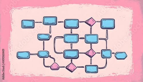 flowchart, cartoon, diagram, blue, pink, rectangle, diamond, connection, process, illustration, graphic, design, vignetting, hand-drawn, line, flow, chart, system, planning, strategy, workflow, organisation, management, business, information, technology, network, structure, layout, visual, communication, abstract, concept, creative, idea, problem, solving, thinking, analysis, datum, logic, progression, step, sequence, diagrammatic, schematic, outline, presentation, scheme