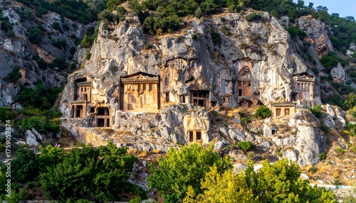 Carved ancient rock tombs on a mountain side, with multiple structures visible in the sunlit stone, lush greenery framing the scene