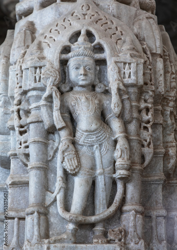 Carved idol made of white marble on the wall of Tirthankar jain temple, Rajasthan, Ranakpur, India