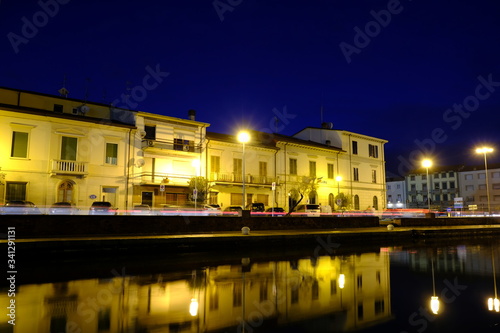 Casa illuminata di notte e riflessa nel canale del mare, porto a Viareggio