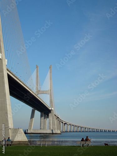 Casal a conversar junto ao rio - ponte Vasco da Gama em Lisboa