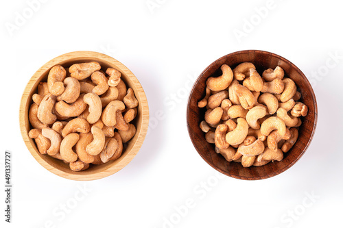 Cashew nuts in wooden bowl isolated. Top view