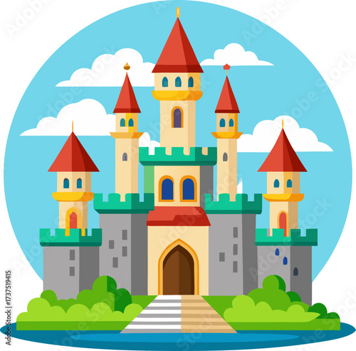 castle, cartoon, vector, tower, building, illustration, mediaeval, house, fairy, architecture, fortress, tale, fantasy, fairy tale, flag, old, art, palace, kingdom, home, town, princess, fort, gate, landscape