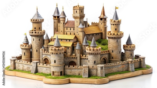 castle, model, miniature, architecture, building, mediaeval, fortification, tower, wall, stone, structure, design, isolated, white, background, craft, detail, intricate, perspective, render, three-dimensional, object, photo, image, illustration, construction, historical, heritage, fantasy, royalty, turret, battlement, gate, window, roof, church steeple