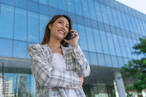 asian, woman, business, female, lady, smartphone, mobile, phone, digital, smile, smiling, cheerful, happy, young, adult, people, building, exterior, modern, urban, glasses, finance, financial, office, outdoors, holding, app, connection, online, working, work, employee, suit, beautiful, elegant, technology, success, go, walking, communication, businesswoman, person, city, lifestyle, professional, talking