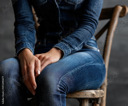 jean, casual attire, sitting, wooden, chair, relaxed, fashion, style, hand, minimalist, background, outfit, denim, female, seated, pose, comfort, urban, modern, lifestyle, clothing, apparel, expression, mood, casual clothes, comfortable, trendy, portrait, simplicity, pattern, texture, elegance, leisure, attire, chic, classic, contemporary, social, modelling, stylish, studio, indoor, beauty, person, body, language, vibe, everyday, wear