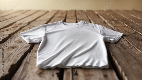 Casual white t-shirt resting on rustic wooden surface in soft lighting