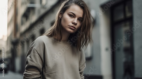 Casual Woman in Neutral Streetwear Posing Against Urban Landscape. Generative AI.