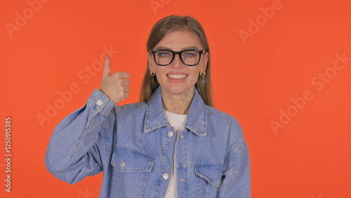 Casual Young Woman with Thumbs Up on Orange Background, Portrait