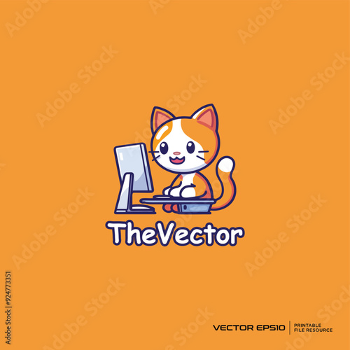 Cat and computer mascot, vector, logo, character, cartoon, illustration, eps10