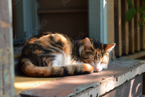 cat curled up on a sunny porch step