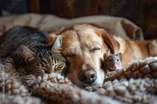 cat, dog, mouse, pet, harmony, coexistence, tabby cat, golden retriever, rodent, friendship, animal, peaceful, resting, tranquil, companionship, domestic animals, mammal, togetherness, trust, serene, bonding, cuddle, home, relax, comfort, fluffy, fur, cuddled, warm, loving, closeup, household, gentle, cute, felino, canino