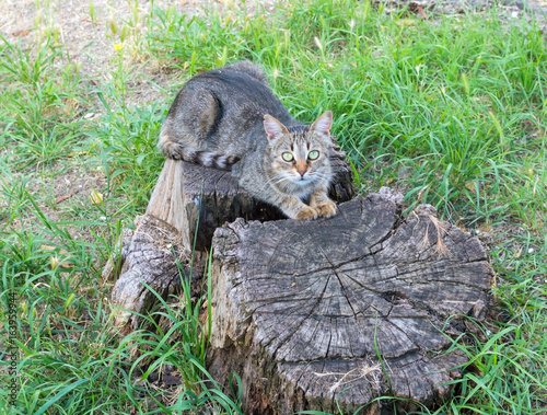 tree, pet, post, hairy, natural, mammal, white, sitting, cat, fur, fence, farm, felino, wood, tricolour, cute, standing, garden, coat, cream, colours, cat, waiting, colourful, outdoors, calico, whisker, beautiful, domestic, nature, pattern, haired, prey, animal, catch, ravenous