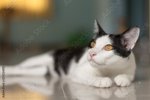 Cat lying on tile in home and looking out of the windows and feel sleepy with reflection of cat on tile