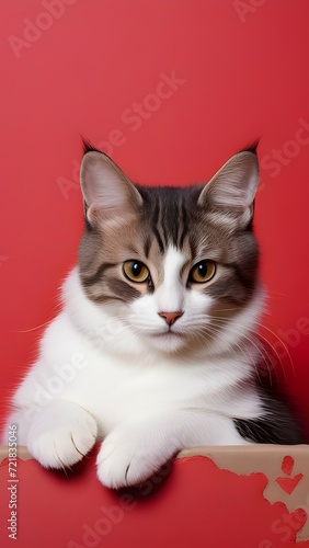 cat, animal, kitten, pet, whisker, cute, portrait, domestic, felino, white, eye, fur, young, cat, eye, looking, red, black, beautiful, red background, red wall, ai