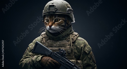 cat, soldier, uniform, holding, rifle, camouflage, military, helmet, weapon, animal, fur, standing, portrait, looking, dark, background, studio, artificial, intelligence, illustration, art, mammal, domestic, felino, gear, brown, green, war, army, protection, guard, equipment, serious, vigilant, alert, defense, combat, security, strong, powerful