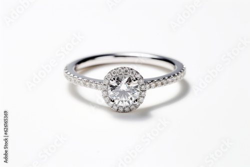 catalogue photo closeup of wedding ring made of white gold, white background. AI Generated