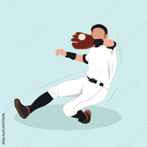 catch a baseball. Illustration Of A Baseball Player In Action, Diving To Catch A Ball With His Glove.