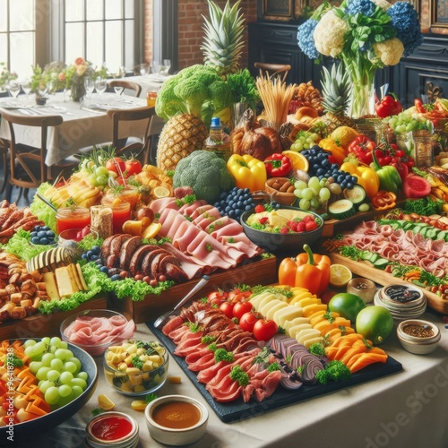 catering buffet food indoor in restaurant with meat colorful fruits and vegetables.