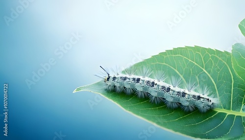Caterpillar on leaf, intricate pattern, blurred nature background, 3D illustration.