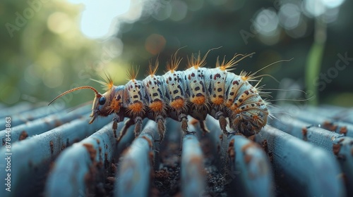 Caterpillar on Radiator, A caterpillar crawling on a radiator, symbolizing transformation and the interplay between life and machinery