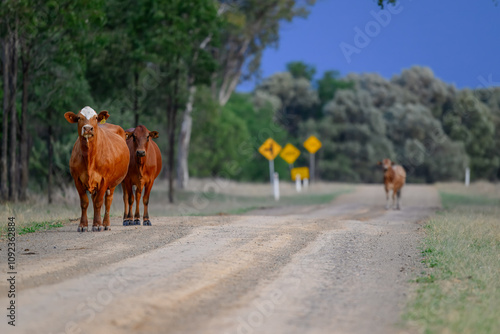 Cattle cows on dirt road, rural country landscape, farming agriculture industry, Australia bush landscape