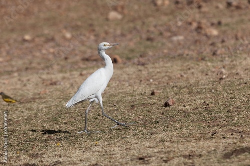 Cattle egret, Bubulcus ibis, on a field in East Africa.