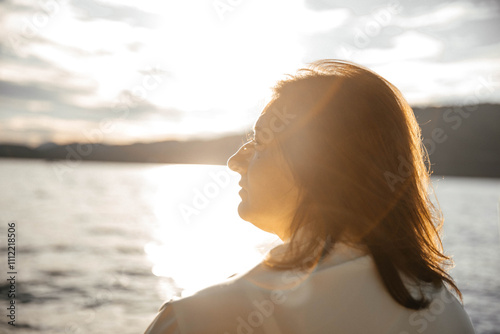 woman, sunset, lake, tranquil, caucasian, adult, water, serene, peaceful, nature, landscape, sunlight, sky, horizon, hair, outdoors, contemplation, silhouette, relaxing, scene, beauty, light, mountain, cloud, glow, meditative, warmth, scenic, calm, environment, dusk, alone, solitude, shimmering, gaze, moment, quiet, peacefulness, introspection, day, view, rest, shine, ambient, gold