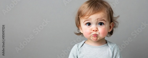 Caucasian baby pulling a funny face and making a fish mouth with chubby cheeks. Cute child concept. Adorable infant for birthday greeting card. Banner with copy space