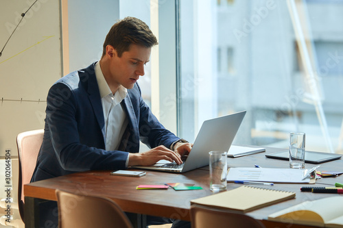 Caucasian businessman wearing a grey smart suit typing on laptop, replying to emails at the office space. Supplies and smartphone scattered around him. Serious and worried expression on his face.