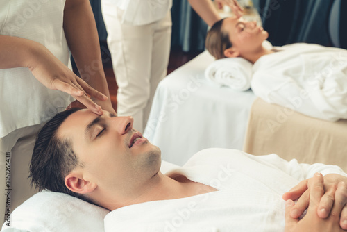 Caucasian couple enjoying relaxing anti-stress head massage and pampering facial beauty skin recreation leisure in dayspa modern light ambient at luxury resort or hotel spa salon. Quiescent