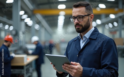 Caucasian factory manager or CEO holding tablet computer and checking production results in industrial plant while employees working in background. High quality