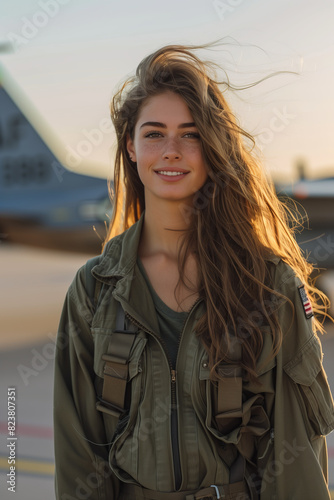 caucasian, female, airman, smiling, confidence, fighter, jet, car park, soldier, aviation, aeroplane, military, uniform, aircraft, air, person, cockpit, professional, plane, flight, pilot, airforce, portrait, woman, courage, diversity, army, dedication, defense, war, proud, leadership, force, flying, fly, sky, aerodrome, generative, american, confident, determination, helmet, training, strength, standing, service, officer, occupation, young